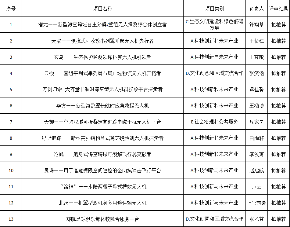根据我校《关于举办第二十三届“郑航挑战杯”大学生创业计划竞赛的通知》安排,经团队申报、学院评审等环节,拟推荐《潜龙——新型海空跨域自主分解/重组无人探测综合体创立者》等13个项目进入校赛。现将结果进行公示,公示期:2025年11月28日——2025年11月30日。公示期间如有异议,可向学院分团委反映。