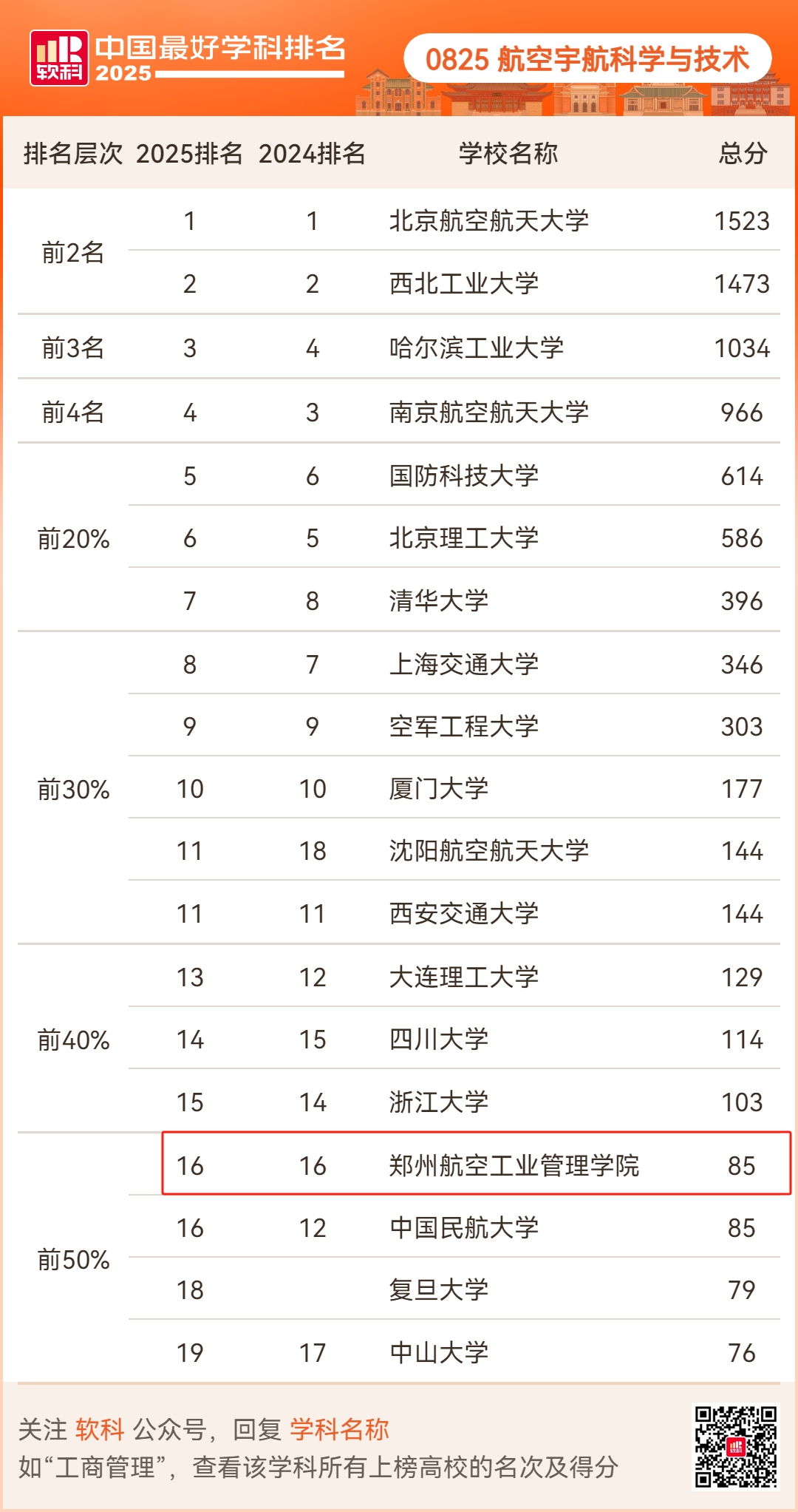 在全国38个具有航空宇航科学与技术学科的硕士点中(含25个博士点),我院牵头航空宇航科学与技术学科进入前50%,也是我校唯一进入中国最好学科榜单的工科学科。彰显了我院学科内涵式高质量发展建设新成果,为创建高水平航空航天大学奠定了坚实基础。(图/上海软科微信公众号、文/陈建威、审核/侯军兴)