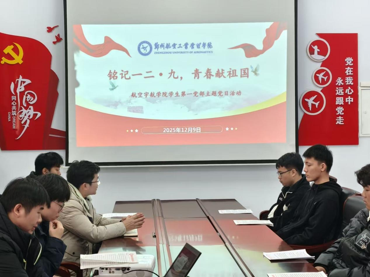2025年12月9日,航空宇航学院学生第一党支部组织开展“铭记一二·九,青春勇担当”主题党日活动,活动由宣传委员余雯绘主持,全体党员同志参加。