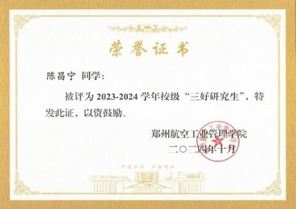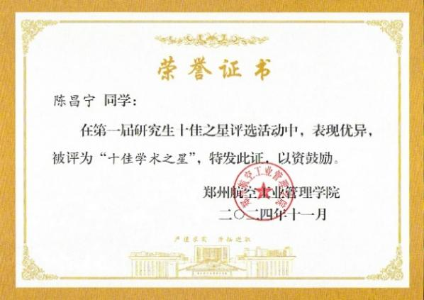 陈昌宁,男,中共党员,郑州航空工业管理学院航空宇航学院航空宇航科学与技术专业2023级硕士研究生,曾担任学院研究生党支部组织委员。本科就读于航空宇航学院飞行器设计与工程专业。他曾获得研究生国家奖学金、校级研究生“十佳学术之星”和“青年五四奖章标兵”等荣誉。